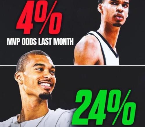 根据Polymarket Sports报道,在揭幕战结束后,文班亚马的MVP概率从赛季前的4%,飙升到惊人的24%,大幅暴涨六倍。而与此同时,他的最新MVP赔率也更新来到+280,一举超越字母哥、约基奇、东契奇等顶级球星,正式登上联盟第一的位置。